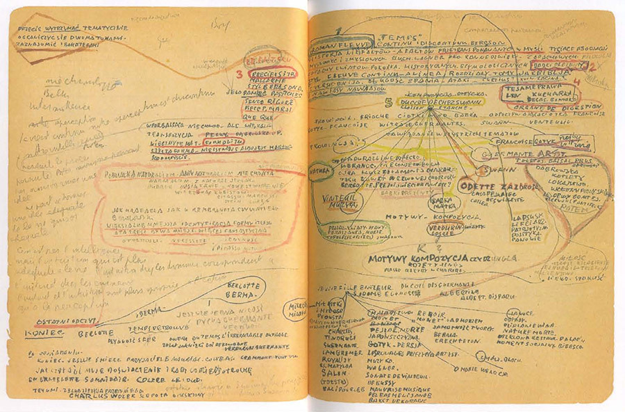 The lectures Czapski gave were unscripted. In preparation, he mapped out a cosmology of Proust… [creating] schematic drawings in a series of prison notebooks. Intended to be used as aide-mémoire, the sheets he covered with information did not represent any kind of text to be spoken; each page was a carefully constructed nesting ground from which ideas might take flight….